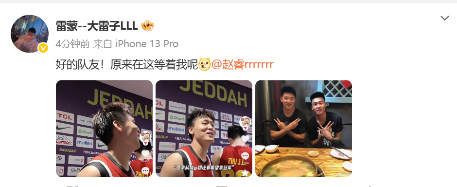 北京男篮球员、刚刚与赵睿一起并肩作战亚洲杯的雷蒙更新了个人社媒,并晒出了两人的合照,欢迎这位新队友的到来。雷蒙在个人社媒写道:好的队友!原来在这等着我呢!
